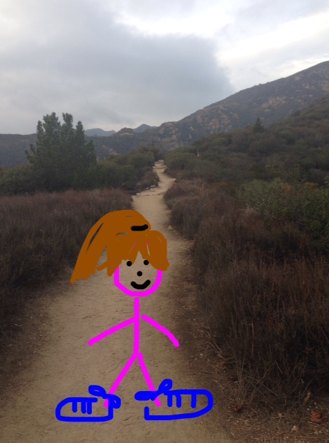 Here’s another photo of me being super pumped because I’m hiking up Echo Mountain in the lower San Gabriels. I’m not wearing my backpack nor am I holding my trekking poles because I set them aside when I stopped to take the picture. Also because when I tried drawing a backpack and trekking poles it looked like I was standing in front of a misshapen couch shooting lasers out of my hands.
