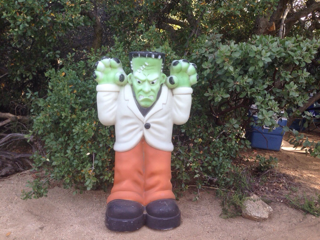 A two-foot tall plastic Frankenstein stands guard in front of a tree. Behind him, another cache. Water, camping chairs, sodas, beer.